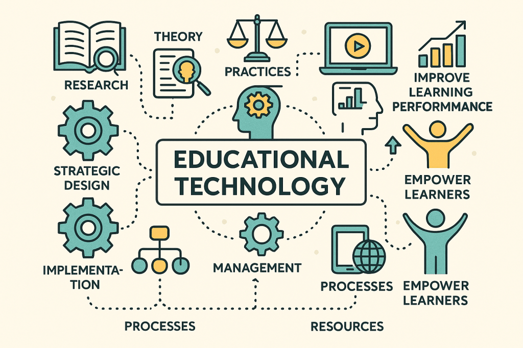 The AECT defines educational technology as “Educational technology is the ethical study and application of theory, research, and practices to advance knowledge, improve learning and performance, and empower learners through strategic design, management, implementation, and evaluation of learning experiences and environments using appropriate processes and resources.”